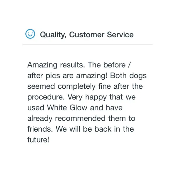 Our mobile van comes to your home for your total comfort and convenience! Our team is fully qualified, ensuring that you receive safe, effective, and personalized care without the need for anesthesia or sedation! At White Glow, our service is affordable, painless, and stress-free. Our cleaning procedures take around 45 minutes to one hour, leaving your pet with a healthy, white, glowing smile, free of tartar and plaque!